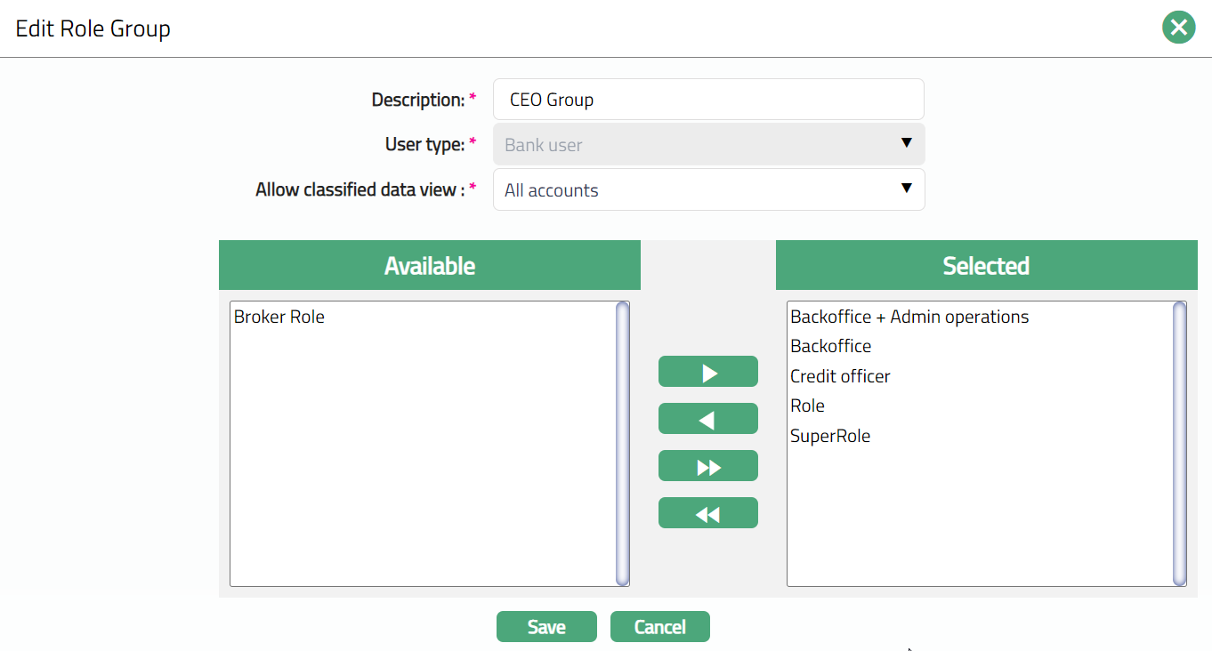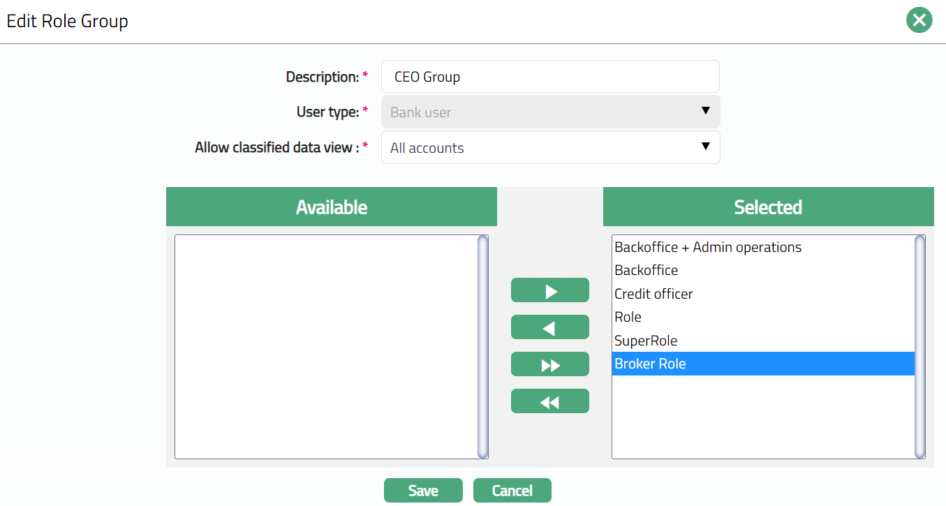 Note: The selected role or roles will be attached to the Role Group. When a User is mapped to this Role Group, she will get access to the screens as defined under the roles attached to the Role Group.