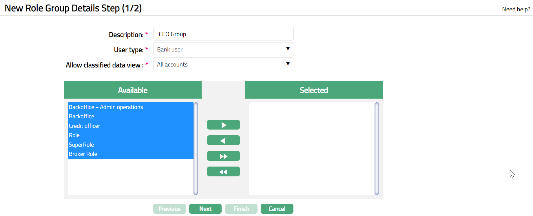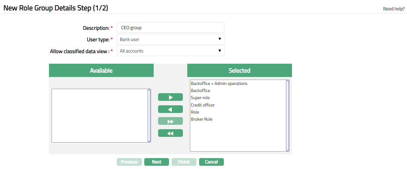 - Click Add button to add a new role group, New Role Group Details Step (1/2) screen will appear.
