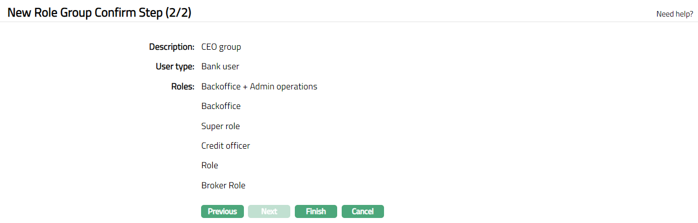 - Click Next. New Role Group Confirm step (2/2) screen appears.