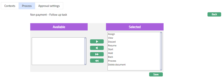 This tab helps you to define the access authority of the selected functionalities available in the process for the selected Role. Hence, all the users with this role will have feasibility to perform the selected functions in the process.