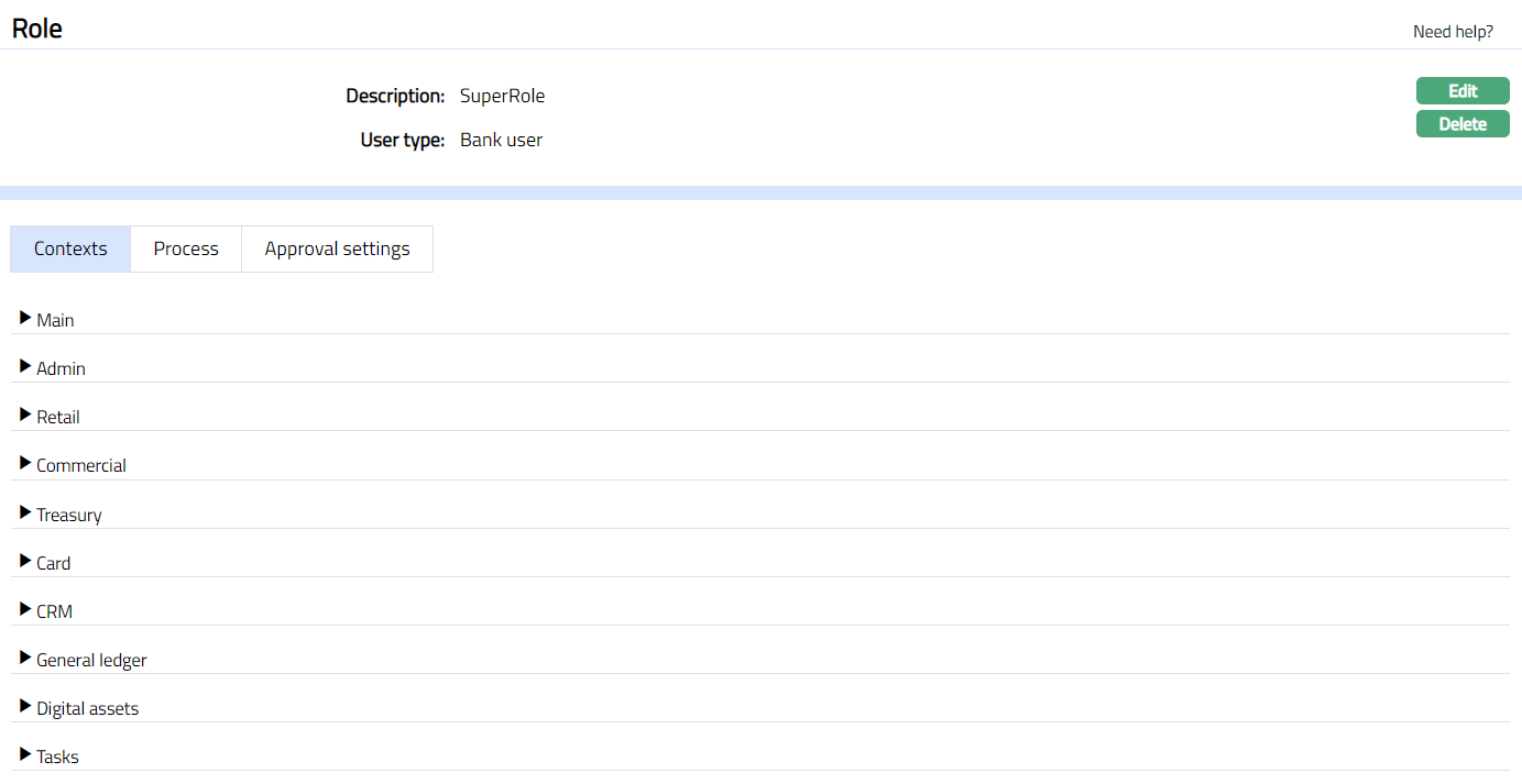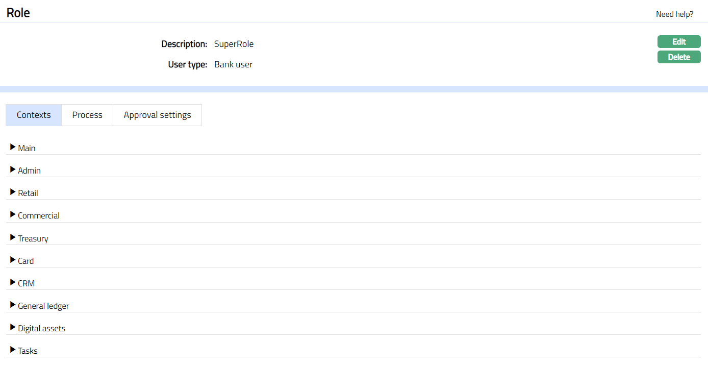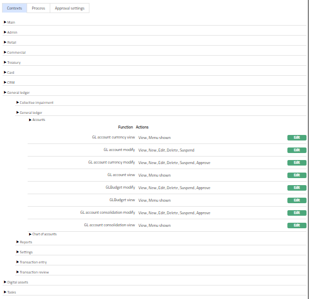 - Click the required Context (Functionality) to see the set of functions and the various actions defined to it. You can View and Edit the set of Actions (Rights) for the required Context (Functionality).