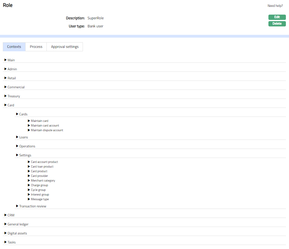 Each of the Contexts (Functionalities) will have an associated set of Functions and each Function has a set of Actions (Rights). You can view and edit the set of Actions (Rights) for the required Context (Functionality).
