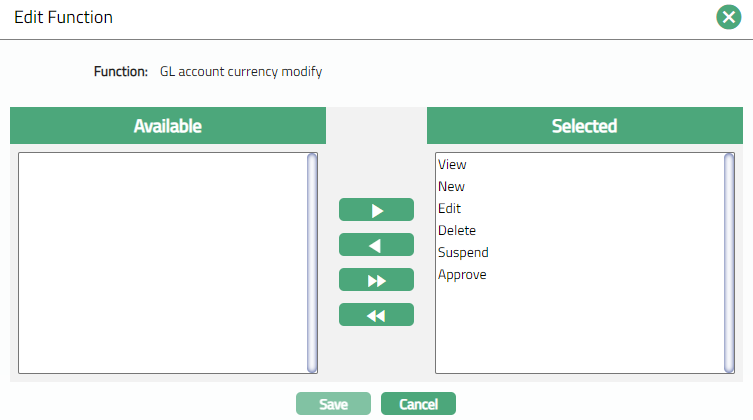 - Click Edit button corresponding to the Function to select the Actions (Rights) for that function. The following screen appears showing the list of Actions available for the selected Function.