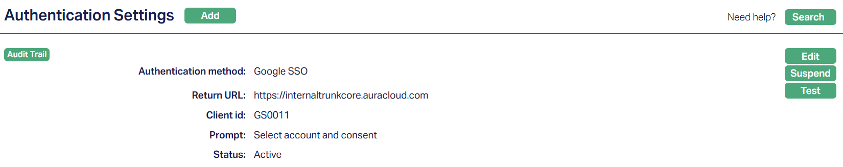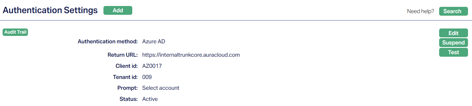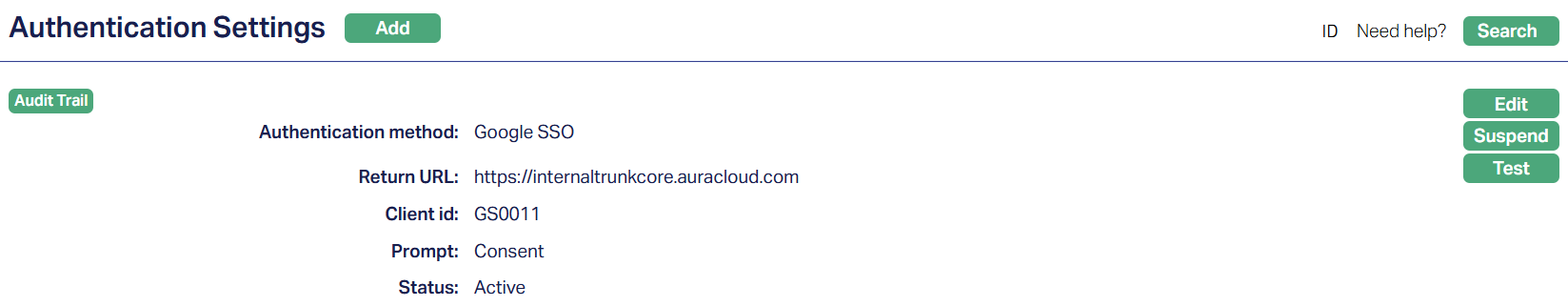 Activate: If you want to activate a suspended Authentication Setting then click on the Activate button. Aura will ask for confirmation. On confirmation, Aura will activate the Authentication Settings and Suspend button will appear in place of the Activate button. The status of the Authentication Setting is set to Active.
