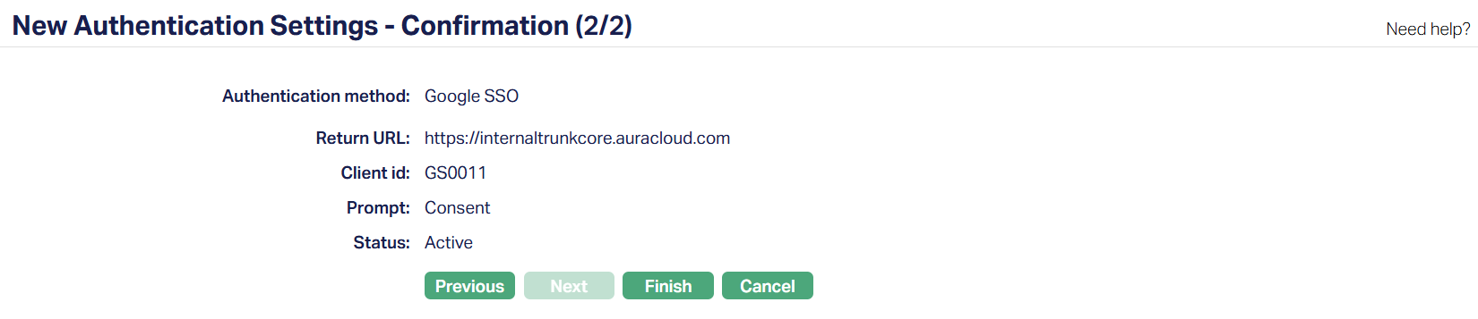 9. Click Finish. The Authentication Settings page will appear with the details you have entered.
