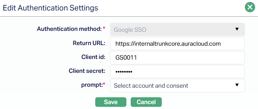 4. Enter the Return URL registered in Google Cloud Console. This is the callback location where Google sends the user after successful authentication. The Redirect URL entered in Aura must exactly match the one configured in Google Cloud console to ensure the login flow works correctly.