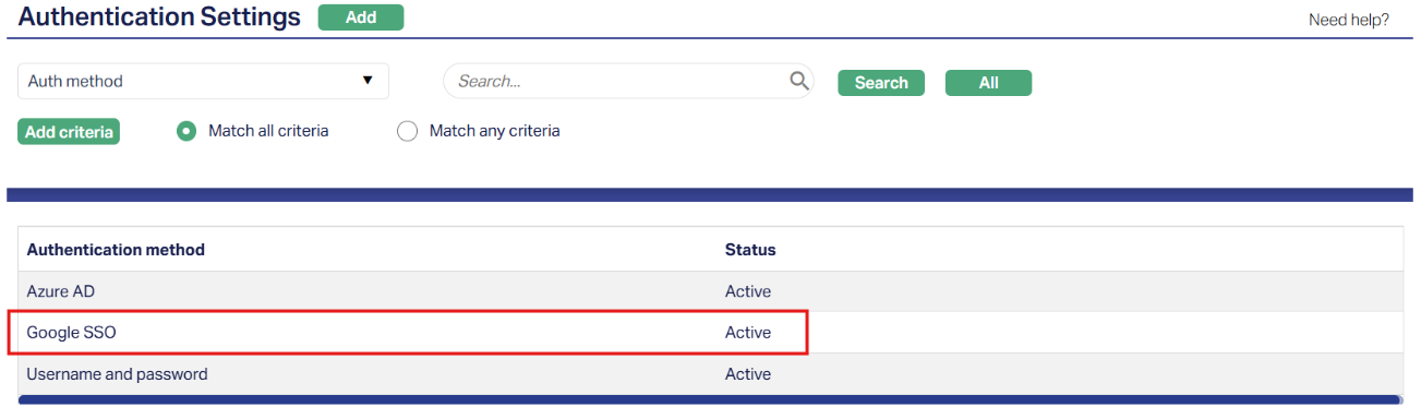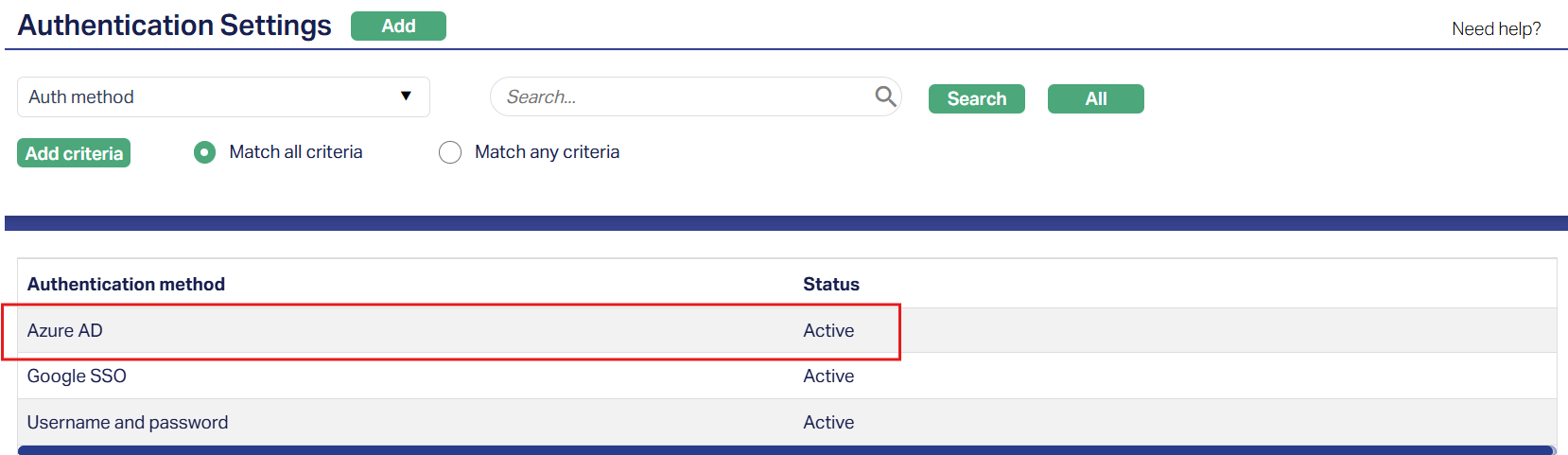 1. Access the Authentication Settings page and click on the active Authentication method you want to modify. Sample screen shown above.