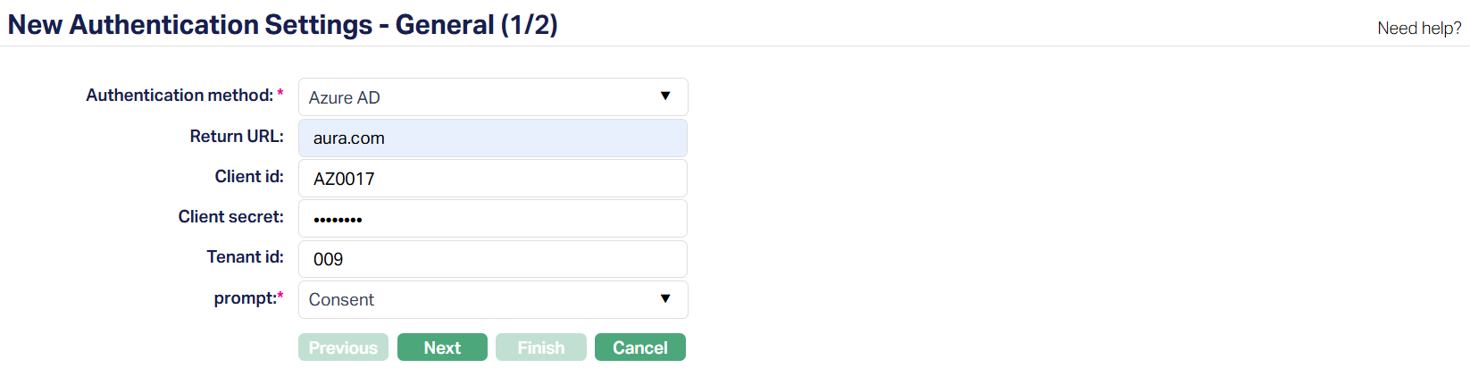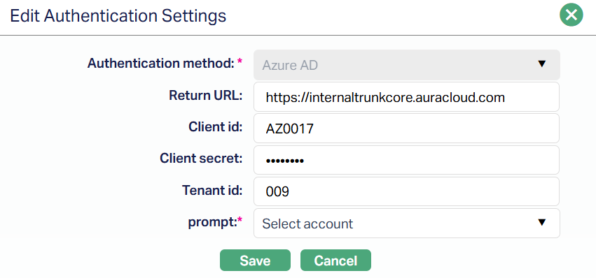 3. Select the Authentication method. The dropdown defaults to Microsoft Azure Active Directory (Azure AD). This determines the login mechanism Aura will use for the setting.