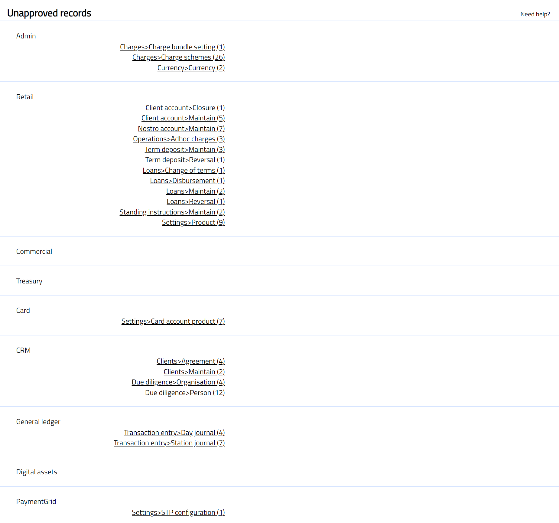 Certain records which are created by a user need approval from another user who is an approving authority. If the record is unapproved the status will remain Pending, and the updated change will not take effect. This option enables you to view all the unapproved records across Aura.