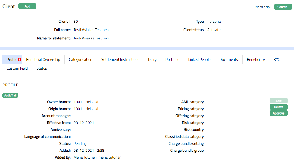 The Approve button is enabled in the unapproved Profile tab of the Client and the Status remains pending.