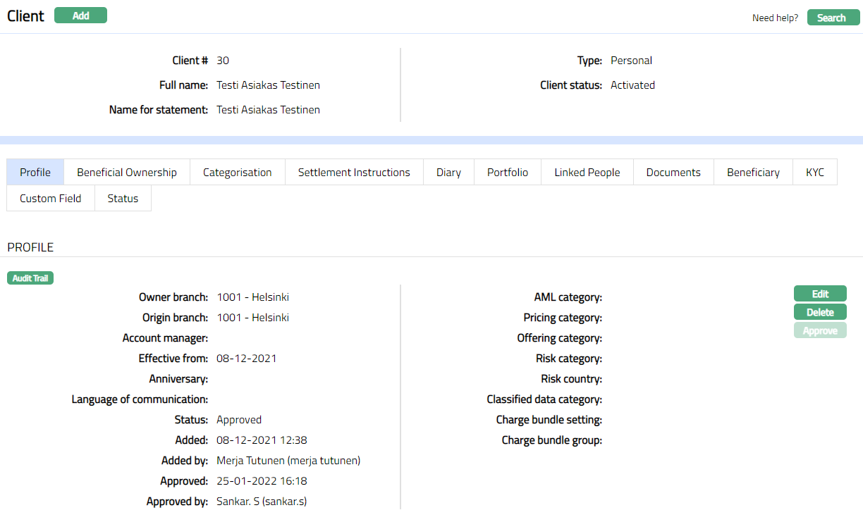 - Click Yes. The unapproved record gets approved and the status in the Profile tab of the Client changes to Approved as shown below and the red bubble disappears.