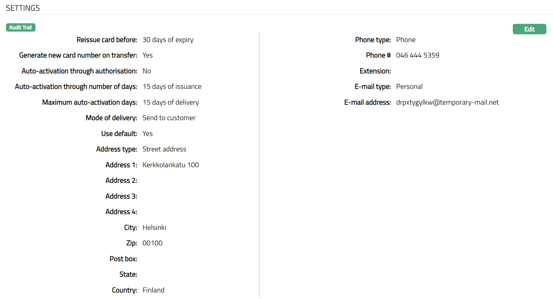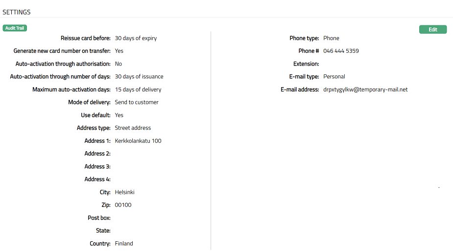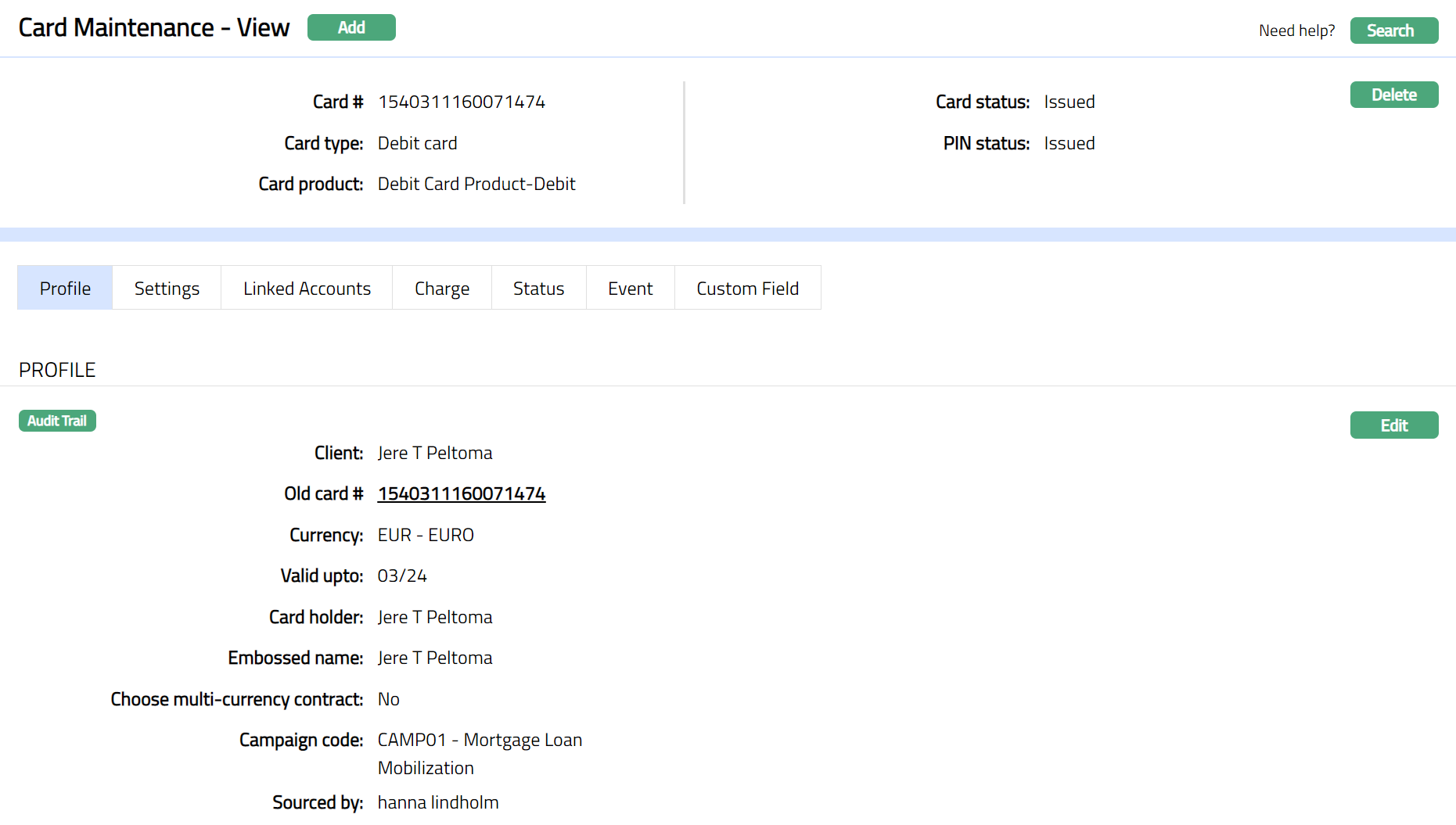 This tab will allow you to view and maintain the settings for the card such as card activation, re-issuance. that are defaulted from the card product.