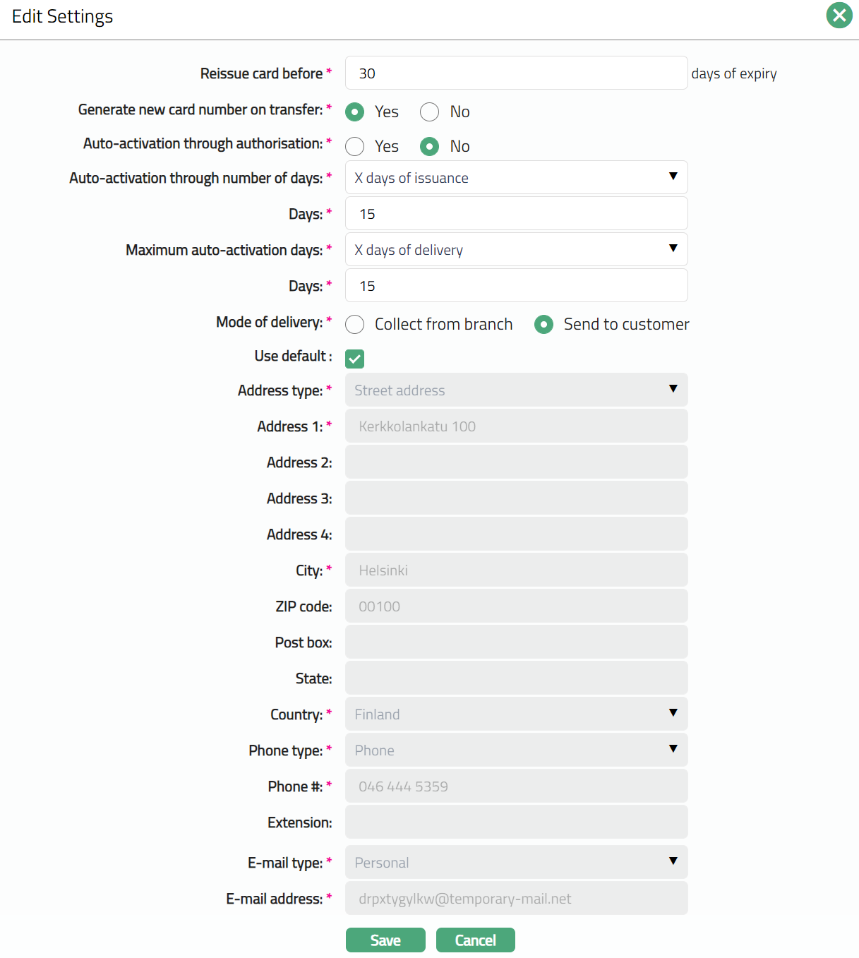 X days of delivery - If this option is selected, then the card is automatically activated within x days after the card is issued to the client.
