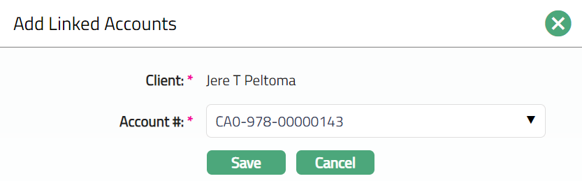 - Click Add. Add Linked Account window appears where the linked client is displayed, and you can select the required account from the drop down. All active client accounts of card owner as maintained under Retail > Accounts > Client account > Maintain are displayed. Only those account numbers linked to the client will be displayed which are not being used for the card.