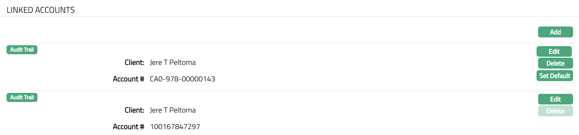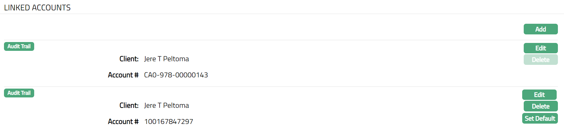 Note: On addition of a new account, Set Default button will be enabled. A click on this button will set the account as a default account linked with the card.