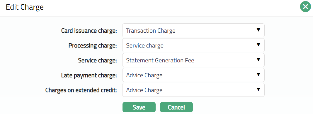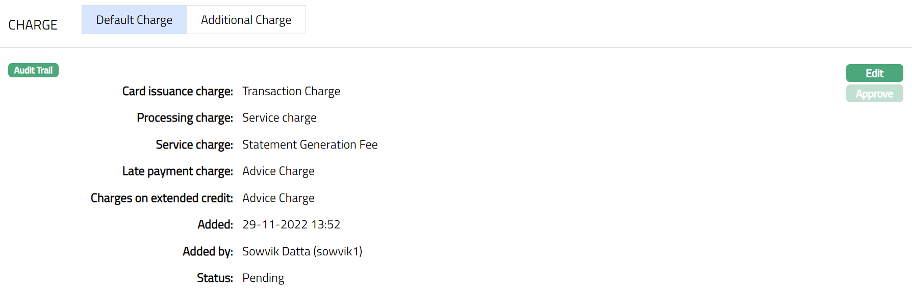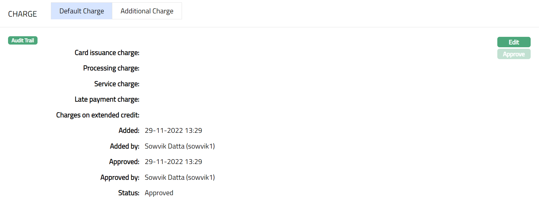 Charge tab allows you to view and edit the details of different charges for the Card Maintenance. The sub tabs available in this tab are Default charge and Additional charge.