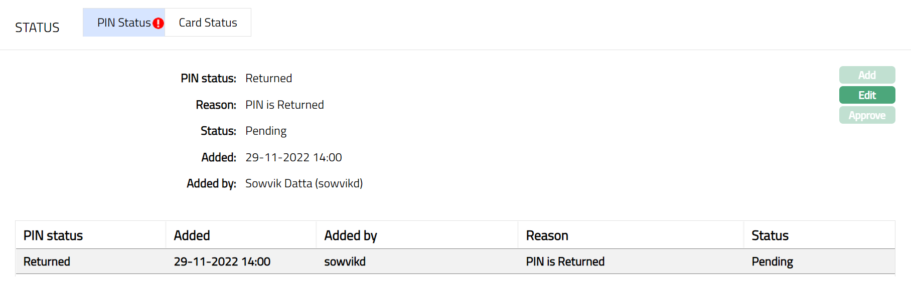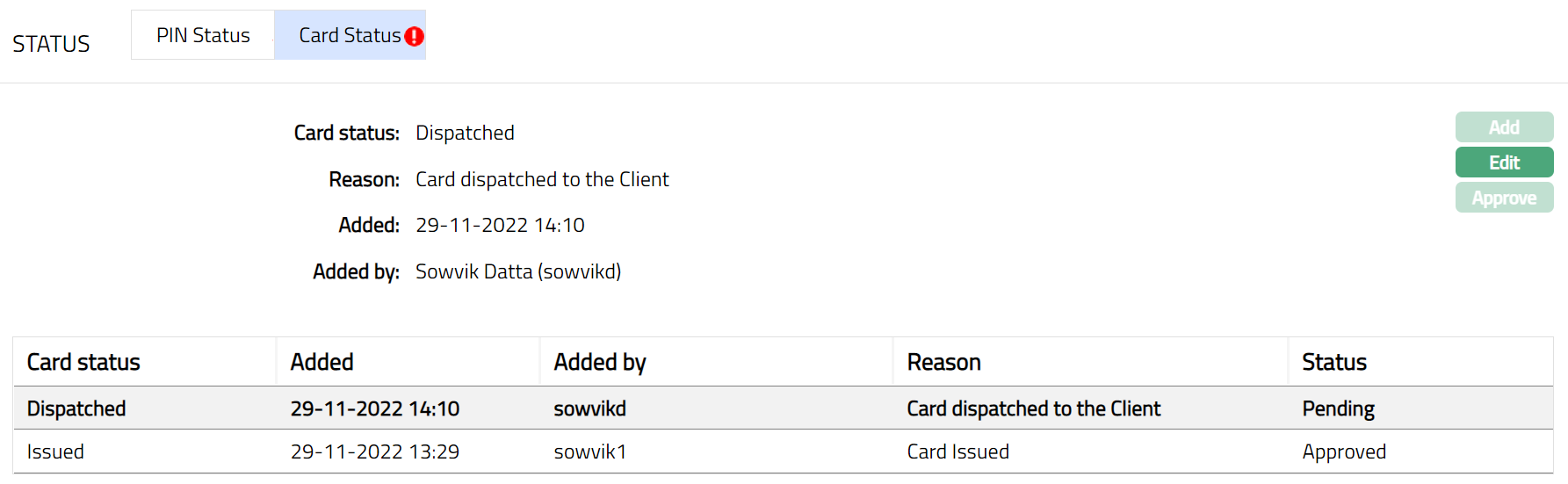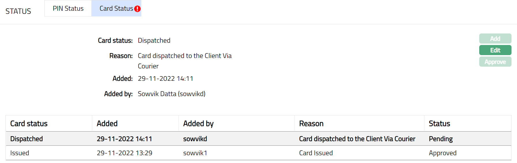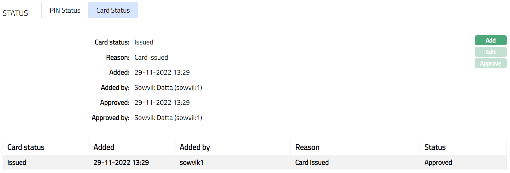 - Click Save. Card Status sub tab page appears with the edited details.
