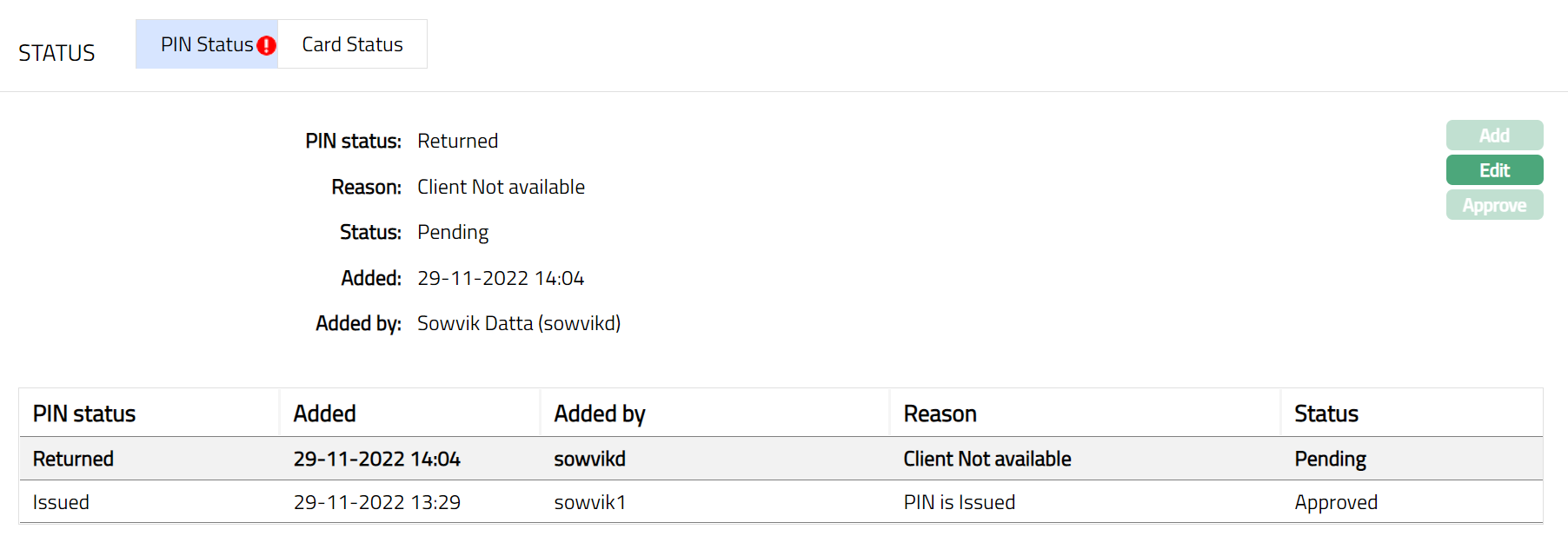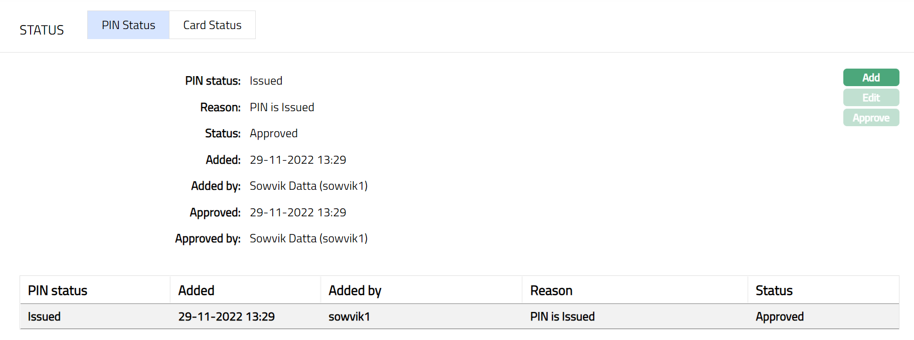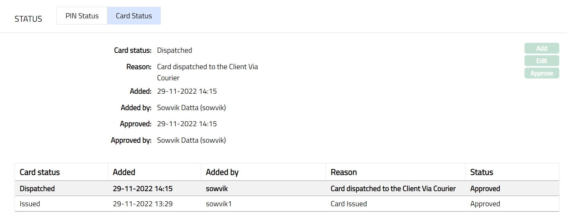 - Click Save. Card Status sub tab page appears with the edited details.