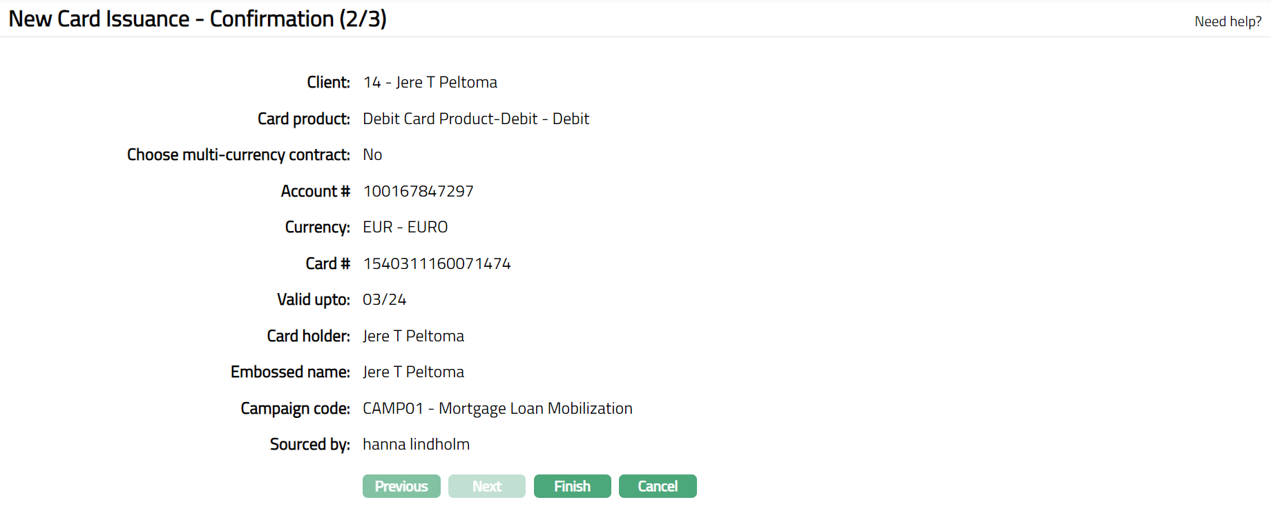 Click Next. New Card Issuance -- Confirmation (2/3) page appears.