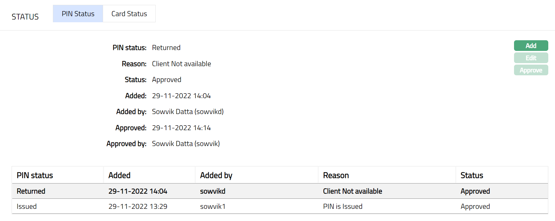 - Click Save. Pin Status sub tab appears with the edited details.