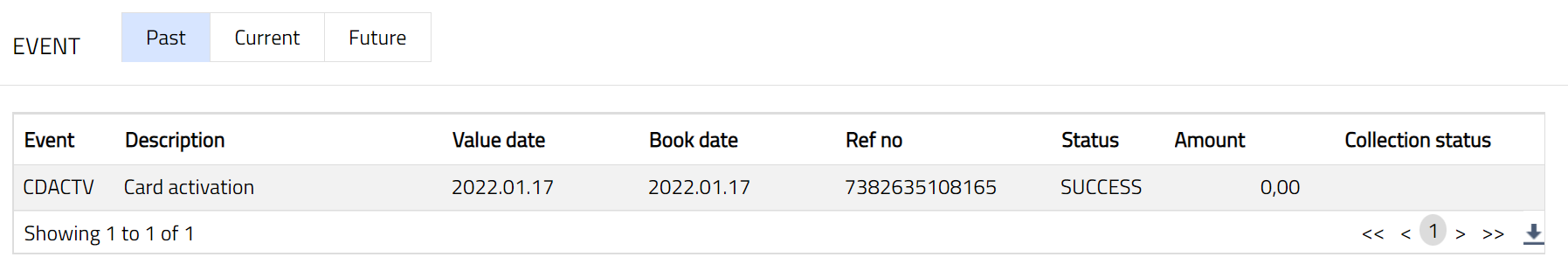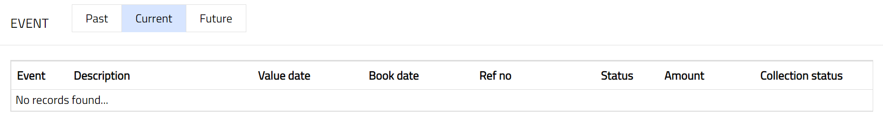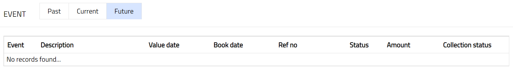 - Access Card page. Click Event tab. There are three sub-tabs within it -- Past, Current and Future. By default, the Current tab is displayed. It shows the details of the Events that have value date = current business date. The Past tab and Future tab show details of events that have value date earlier than / later than the current business date respectively.