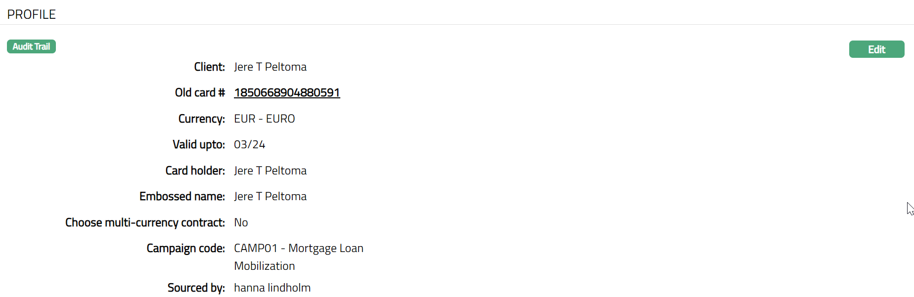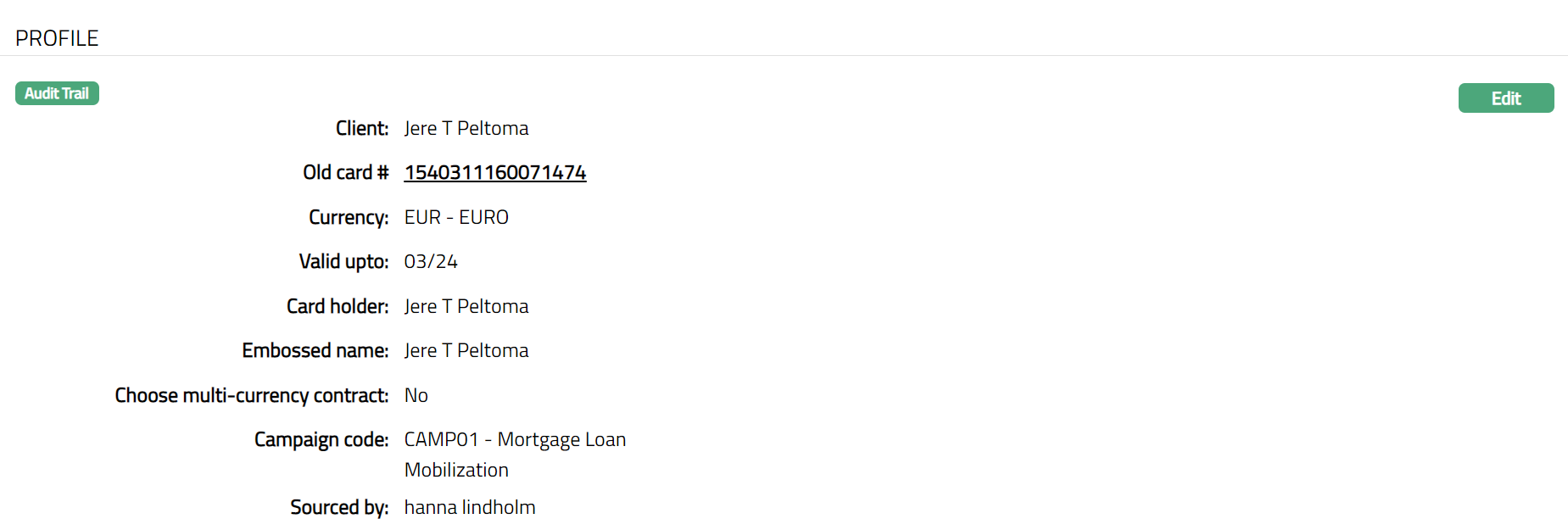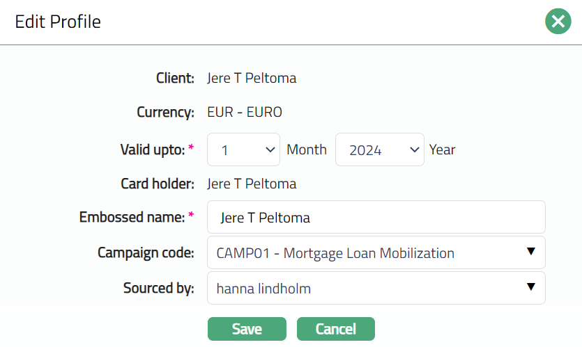 - Access the Card Maintenance - View page. Click the Profile tab to view the details as per sample below. The details are defaulted from the entries that you made during Card Maintenance creation. For details refer to New Card Maintenance -- Profile (1/3).