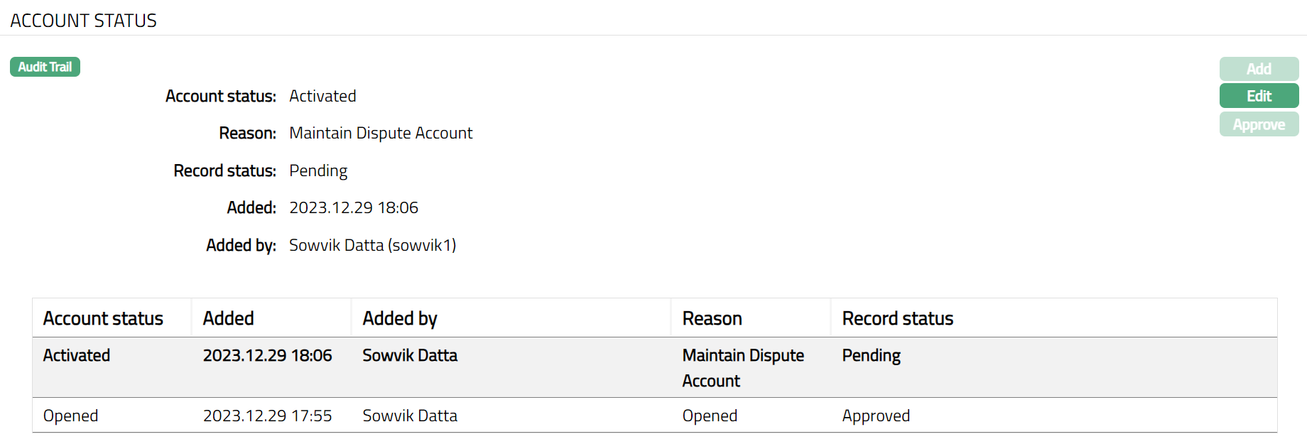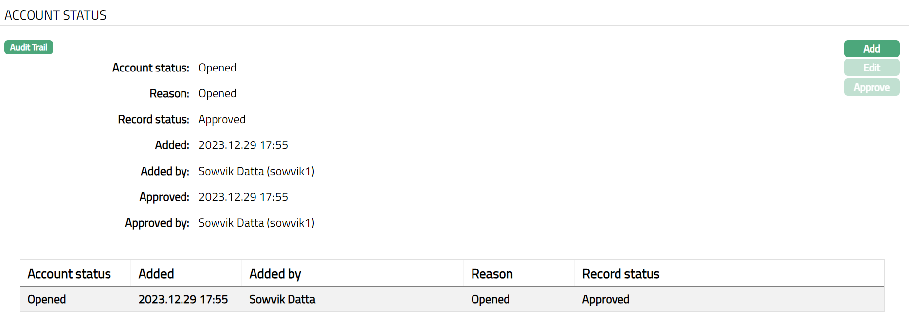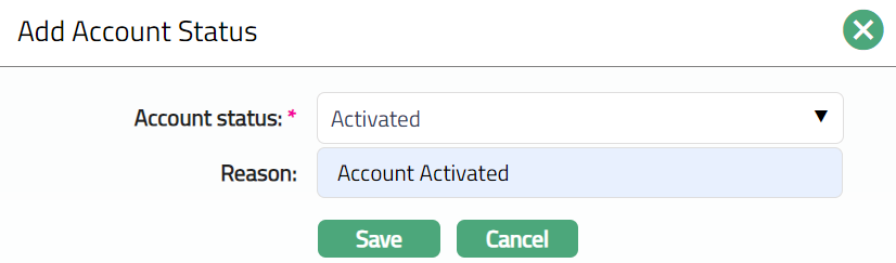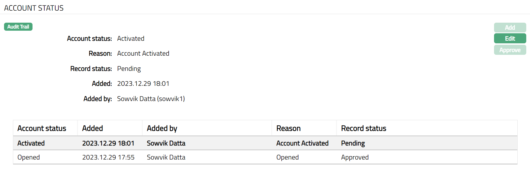 Note: Any user other than the one who added the status can approve it. On approval, the Account status will be Activated, and record status Approved.