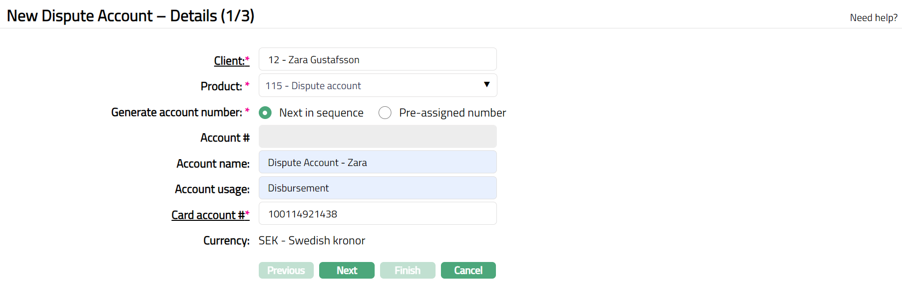 Enter Account usage, i.e. the purpose of the account. In case of dispute accounts opened by the system during Transaction file processing this will be defaulted to Dispute transactions.