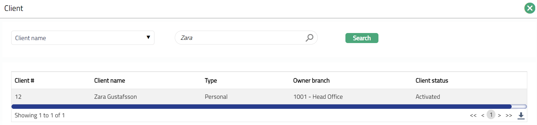 - Select Client by clicking client hyperlink. Client search page appears where you can search for a client with relevant criteria and select the required client. You can also input the client's name and select the required client from the list displayed by Aura.