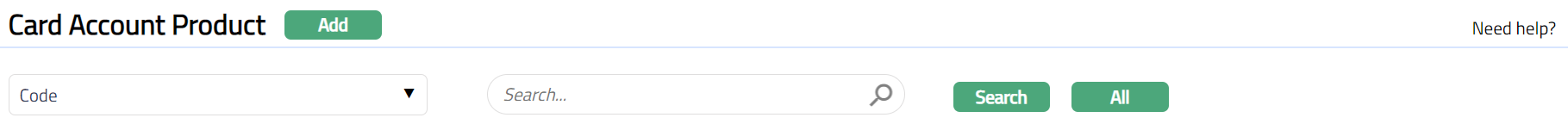 - From Card menu, click Settings, and then Card accountproduct. The Card Account Product Search page appears. All Card account products available in Aura appear on the page.