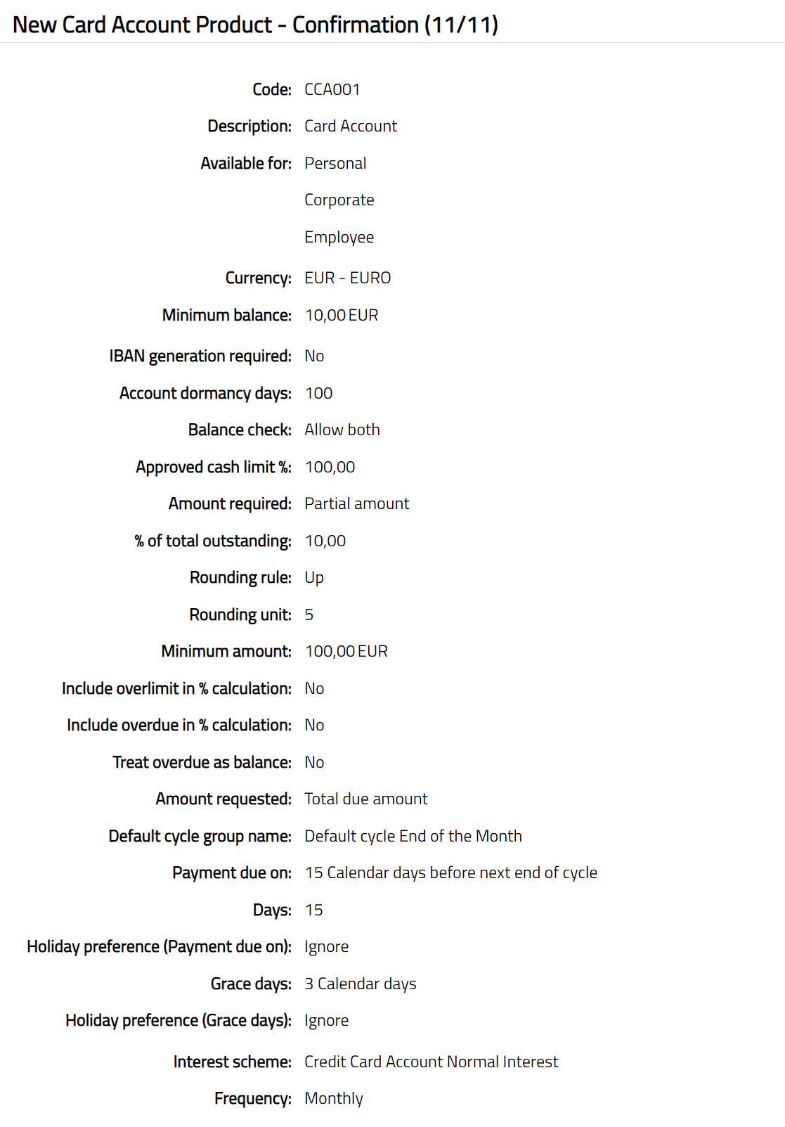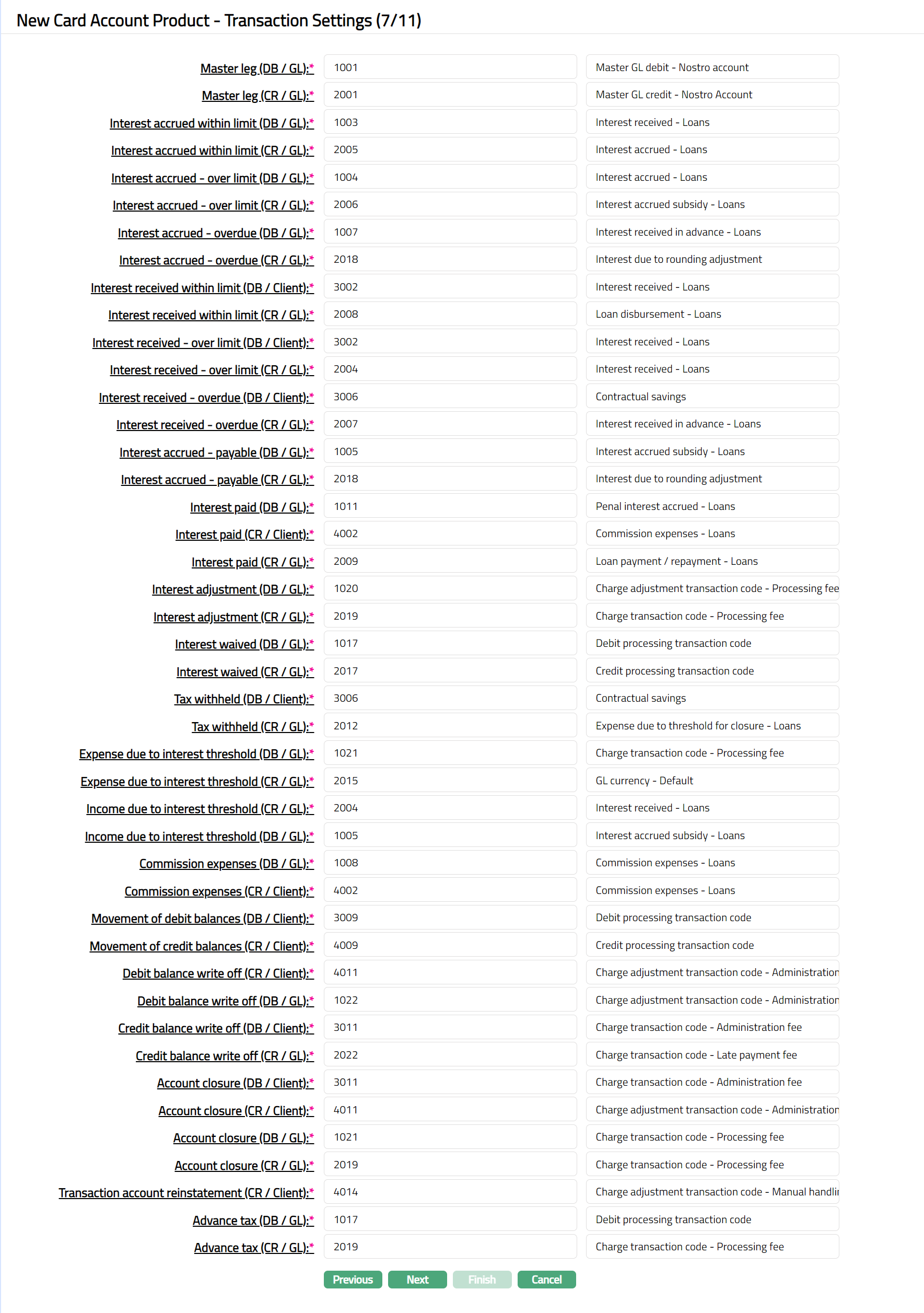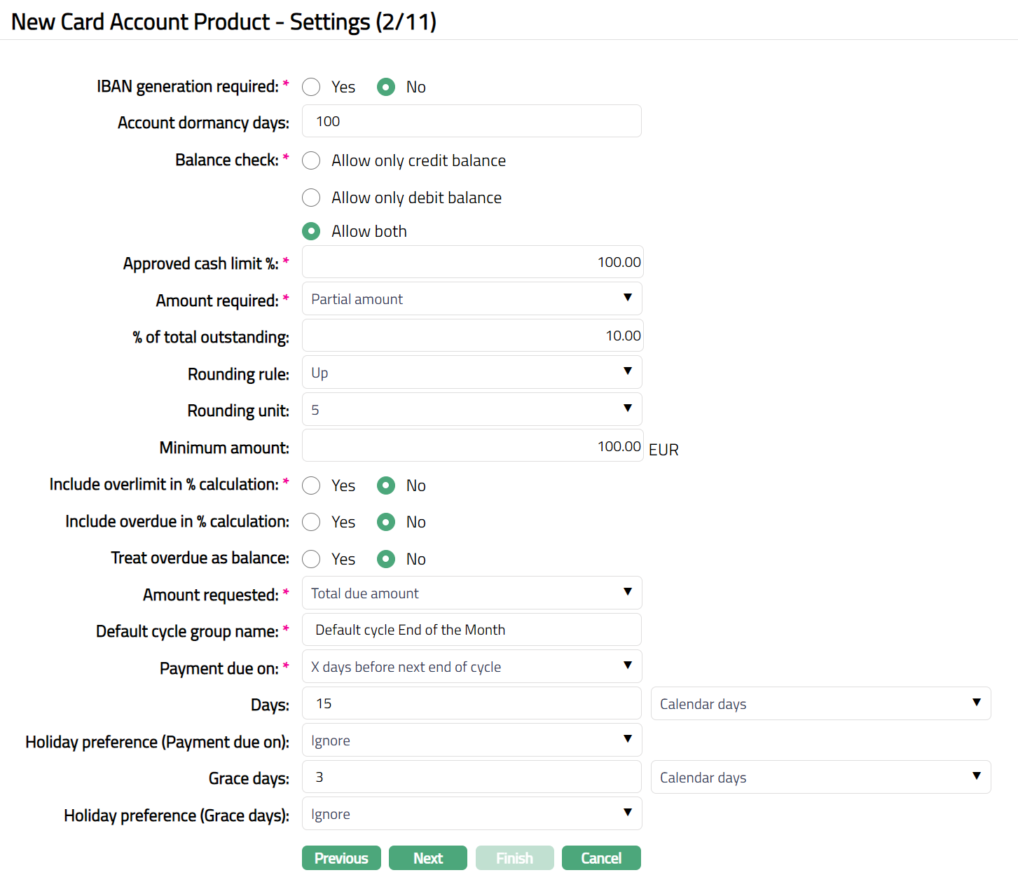 Click Next. New Card Account Product -- Settings (2/11) page appears.