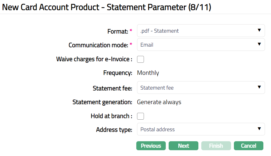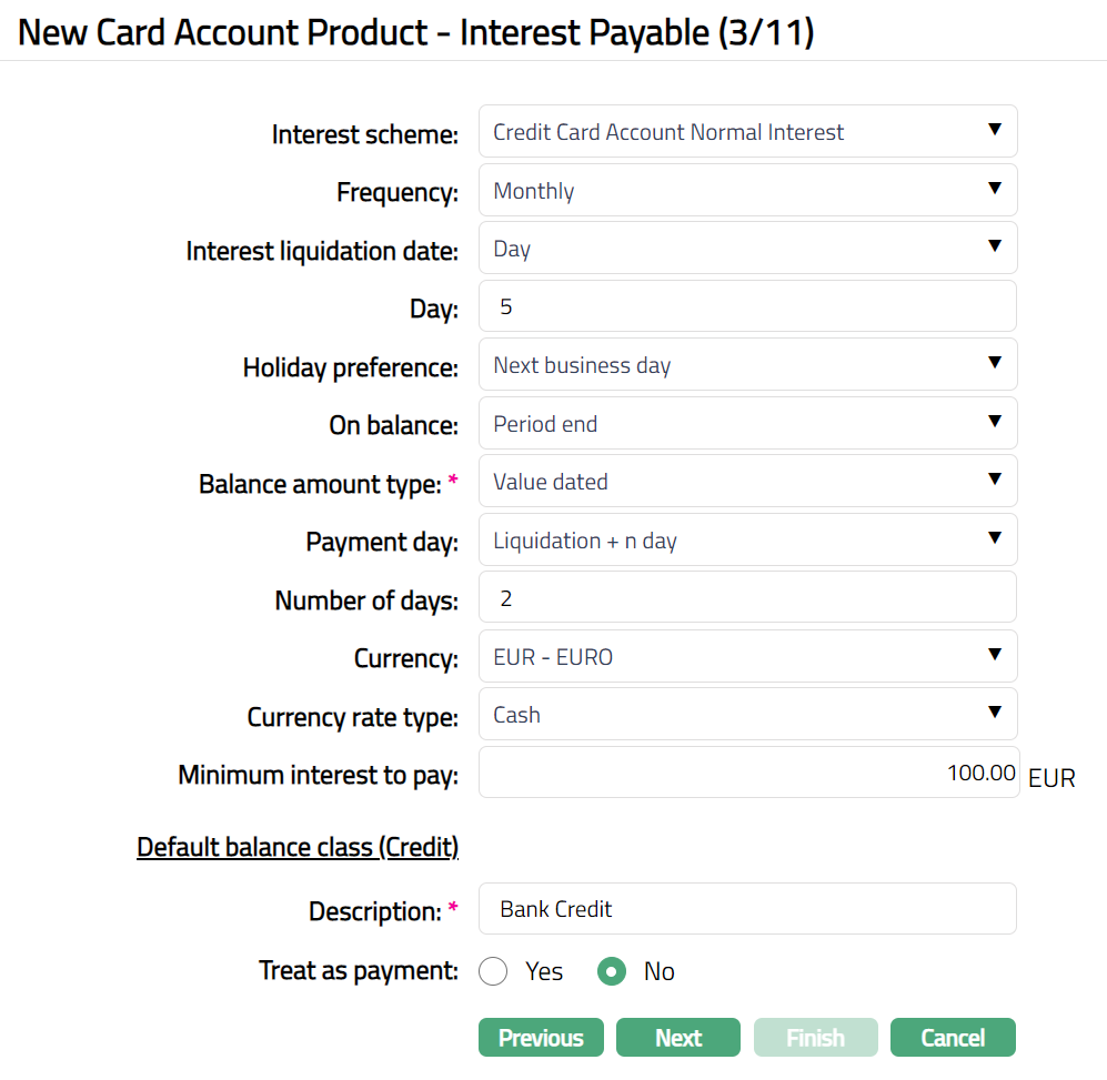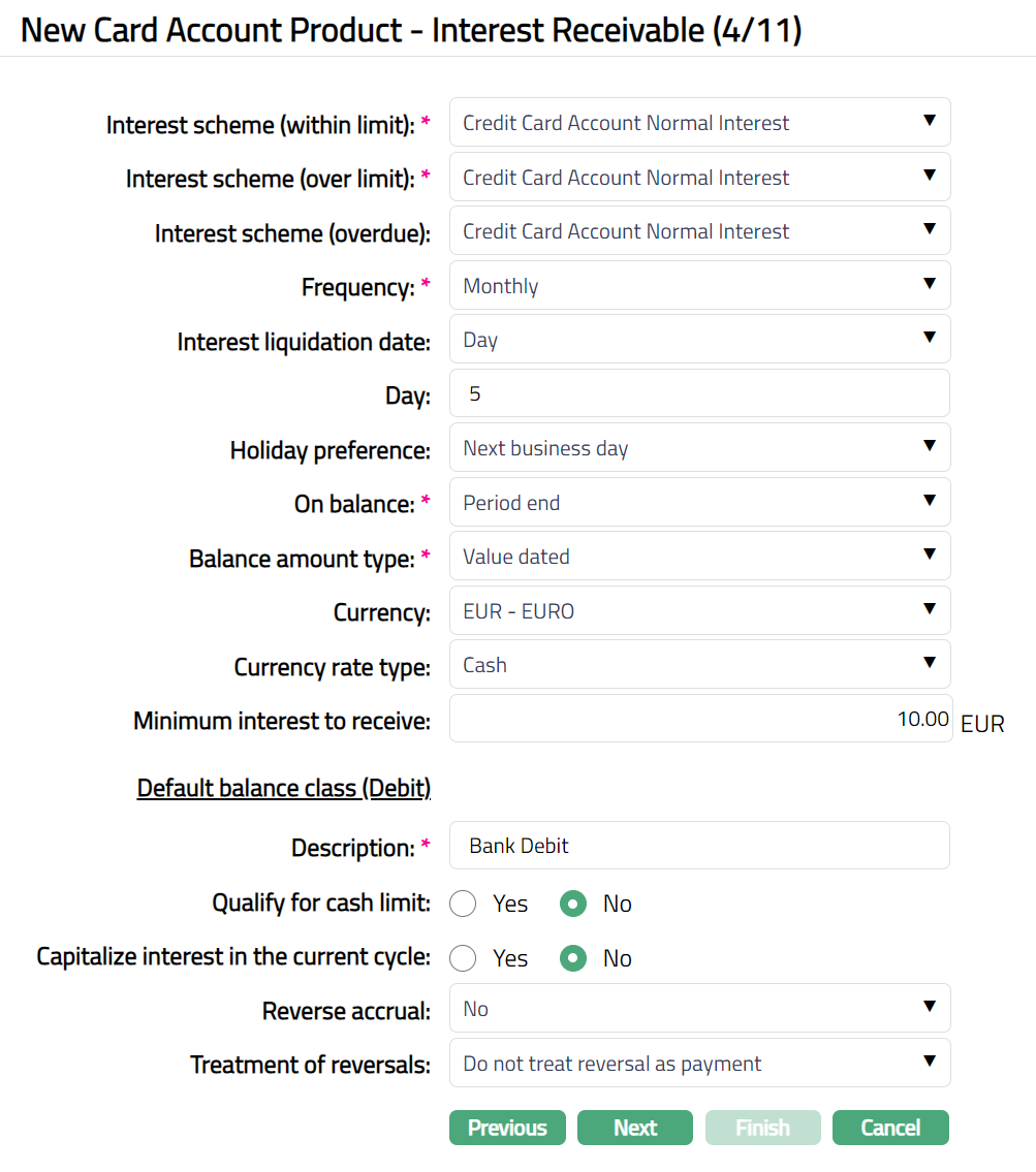 Click Next. New Card Account Product -- Settings (2/11) page appears.