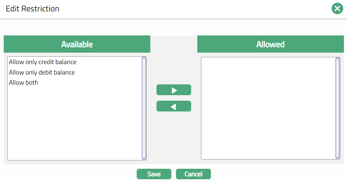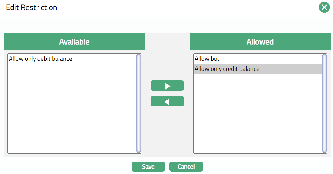 - Allow only credit balance -- If you select Allow only credit balance, then Aura will allow only credit balance for that account. If a transaction would result in a debit balance, and if this account allows only credit balance, the transaction will fail.