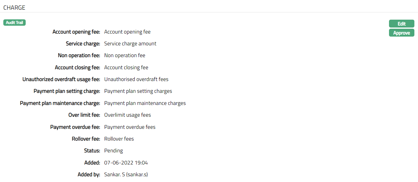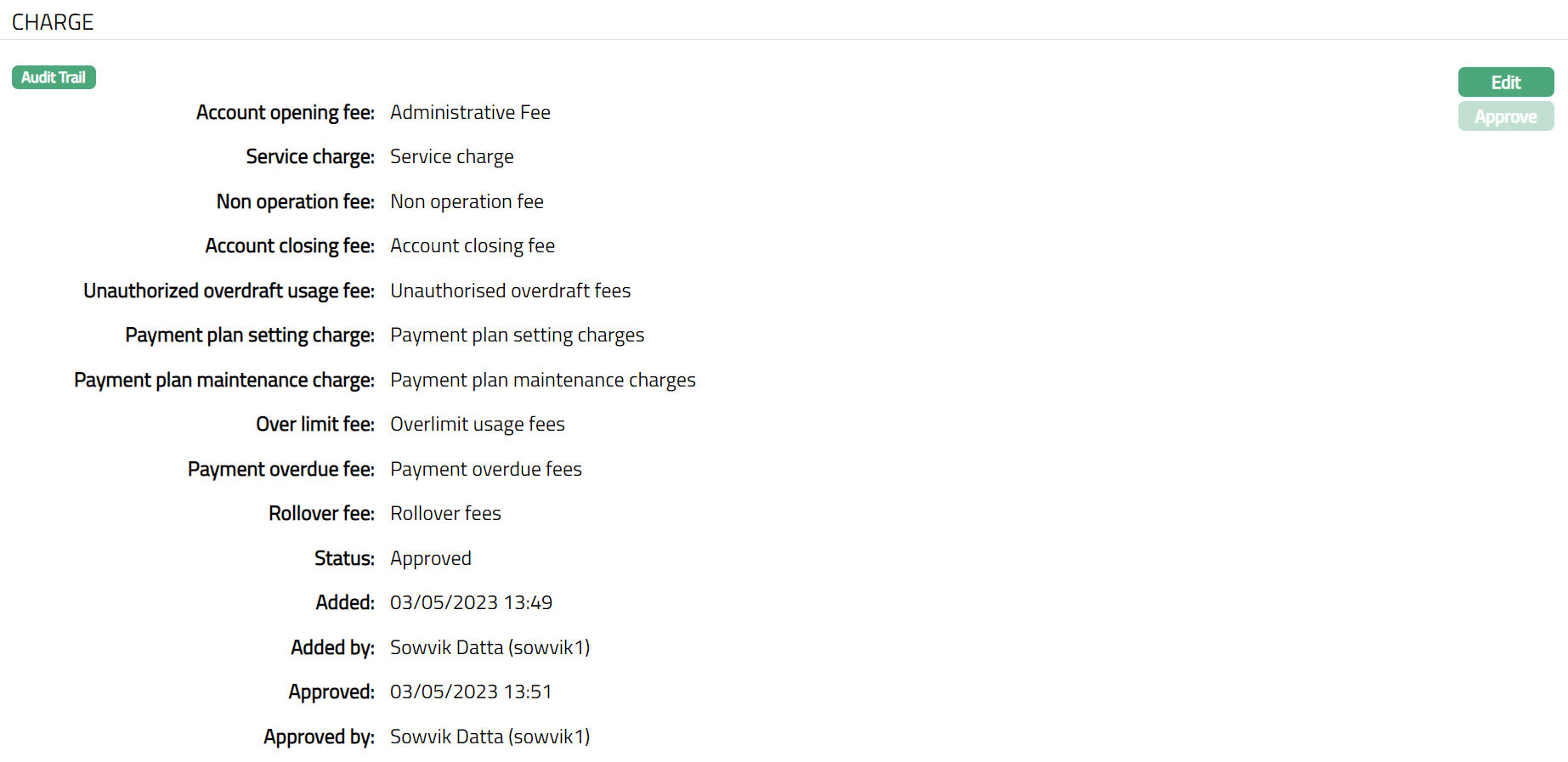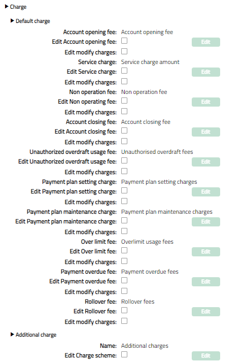 | 10 | Unauthorized overdraft usage fee | Dropdown | Defaulted value will be displayed. Edit button enabled on selection of this field. |