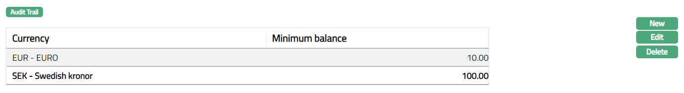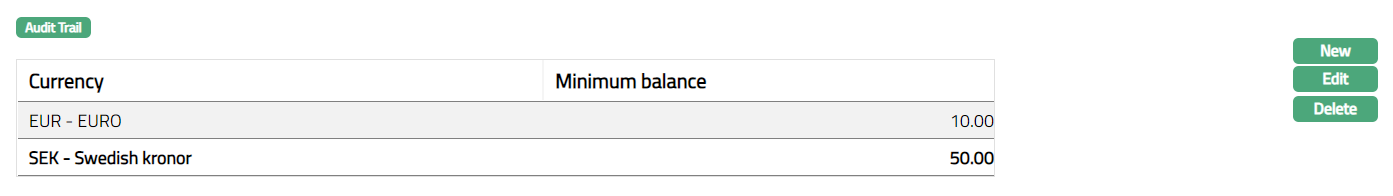| 25 | Debit balance check | Dropdown | Default value will be displayed. Edit button enabled on selection. |