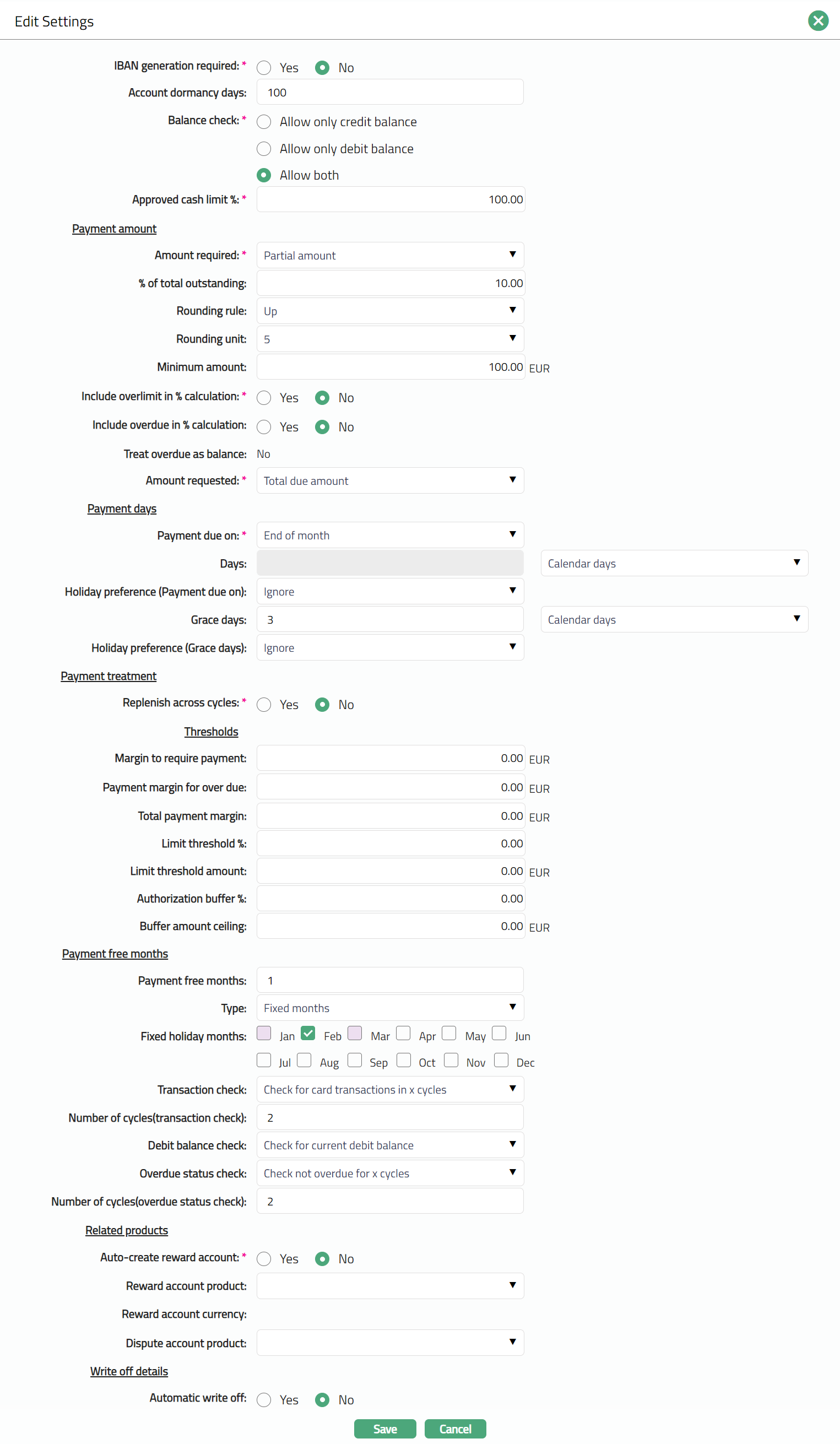 - Include Over limit in % calculation enables you to specify how the amount required is to be calculated when the account balance is over limit. By default, it will be No which means the over limit amount will be added in full; if checked, the over limit will be included in the % calculation and the amount required will be a % of the current due amount (including over limit).