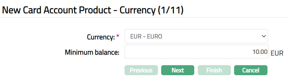 - Click Next. New Card Account Product -- Currency (1/11) page appears.