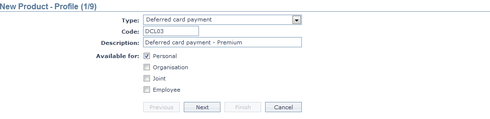 3. Select Deferred Card Payment as the Type from the drop down list for the product. The available options are: