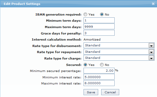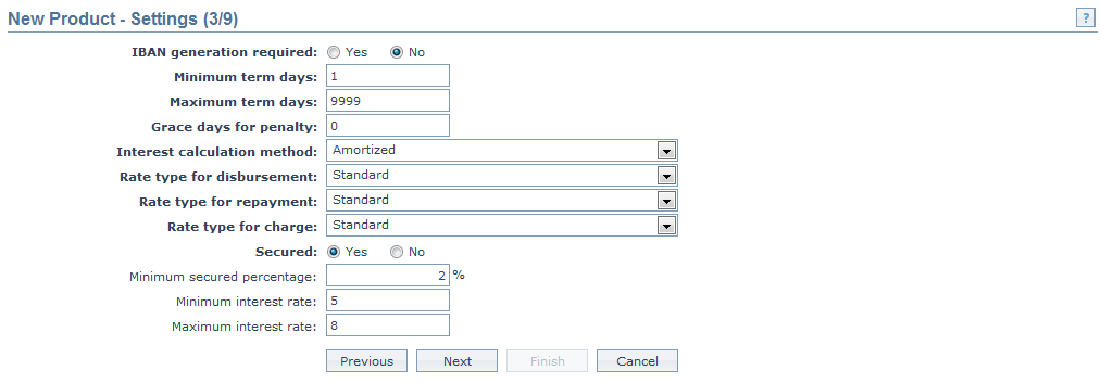 20. Indicate if the loans under this product should be Secured or not using the radio buttons. If this has been selected as Yes, Minimum secured percentage. Minimum Interest Rate and Maximum Interest Rate fields will be enabled.