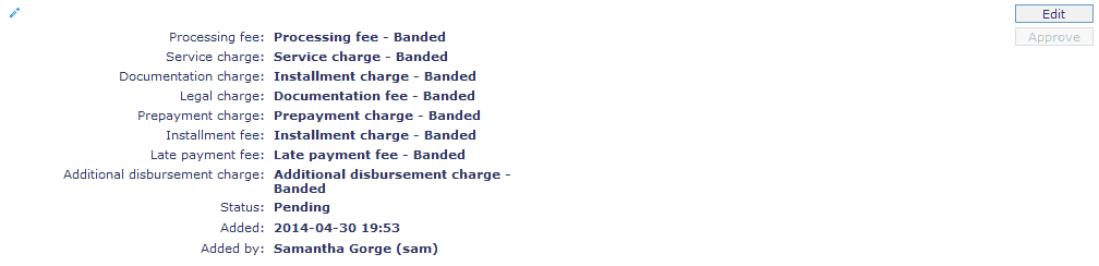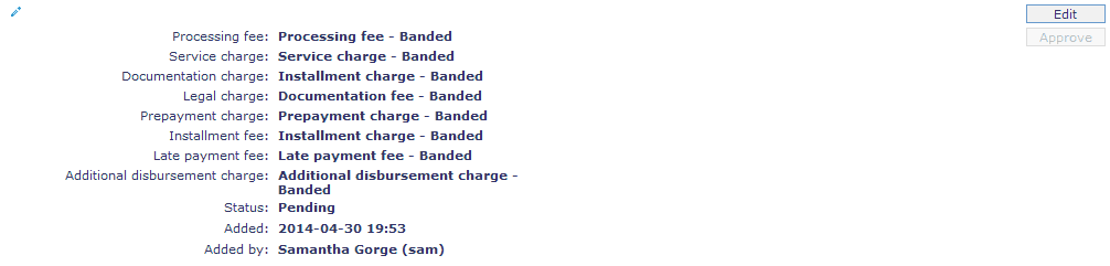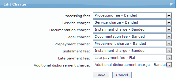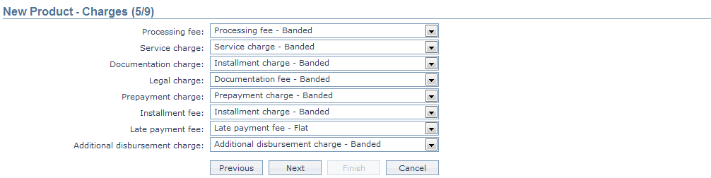 29. If you want to levy a charge for processing the loans under this Product, select the Processing fee from the drop down list of all the Charges where the Charge Type is Event. If the Charge is Banded, the charge amount will be calculated on the basis of the amount sanctioned. The charge amount is collected upon disbursement.