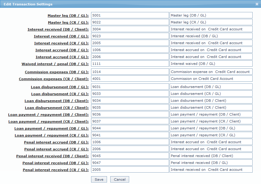 | 13 | Loan disbursement (CR/Client) | for recording all loan disbursement transactions in the Client accounts. | Client account Debit | Disbursement |