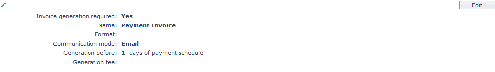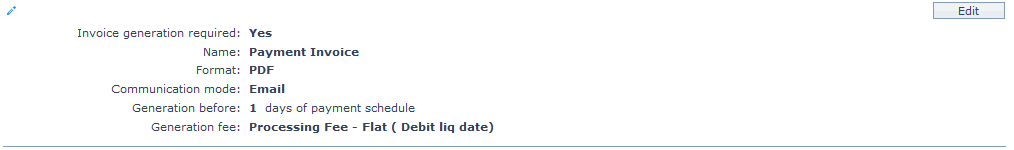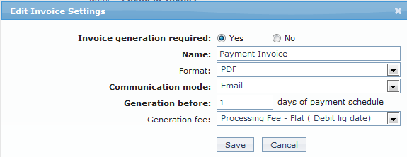 Note: All the fields in Edit Invoice Settings can be updated during edit. If you select No radio button for Invoice generation required field, all the fields will be disabled.