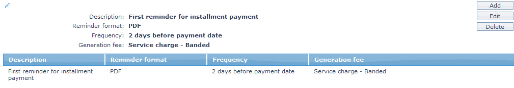35. When you want to levy a Late payment fee, select the Late payment fee from the drop down list of all the Charges where the Charge Type is Event. If the Charge is Banded, the charge amount will be calculated on the basis of the Principal Schedule amount. The charge amount is collected when a user pays after the due date.