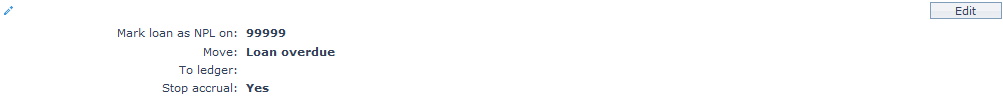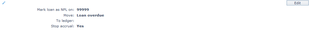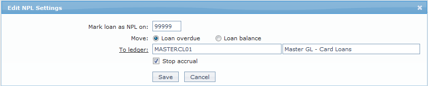 The NPL (Non Performing Loan) settings tab allows you to view and edit various NPL settings for the loans that become Non performing.