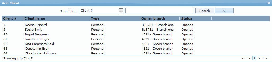 10. Click on Add. The Add Client page appears, where you can search for the required client with relevant criteria and select the required client