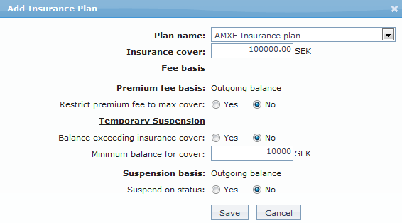 No radio button is selected for Restrict premium fee to max cover option. If you select this option as Yes then the Insurance fee percentage basis calculation will be derived from the maximum cover of the insurance plan only on condition where the sum of outgoing balance of the card loan account and deferred payment balance of a card loan account exceeds the maximum cover of insurance plan