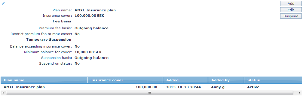 - No radio button is selected for Outgoing balance exceeding ins cover option. If the outgoing balance of the card account is exceeding the Insurance cover maintained, the insurance plan will get temporary suspended automatically. If Temporary suspension is Yes and if Insurance fee basis is selected as outgoing balance then the temporary suspension will get triggered when the outgoing balance is greater than insurance plan cover.