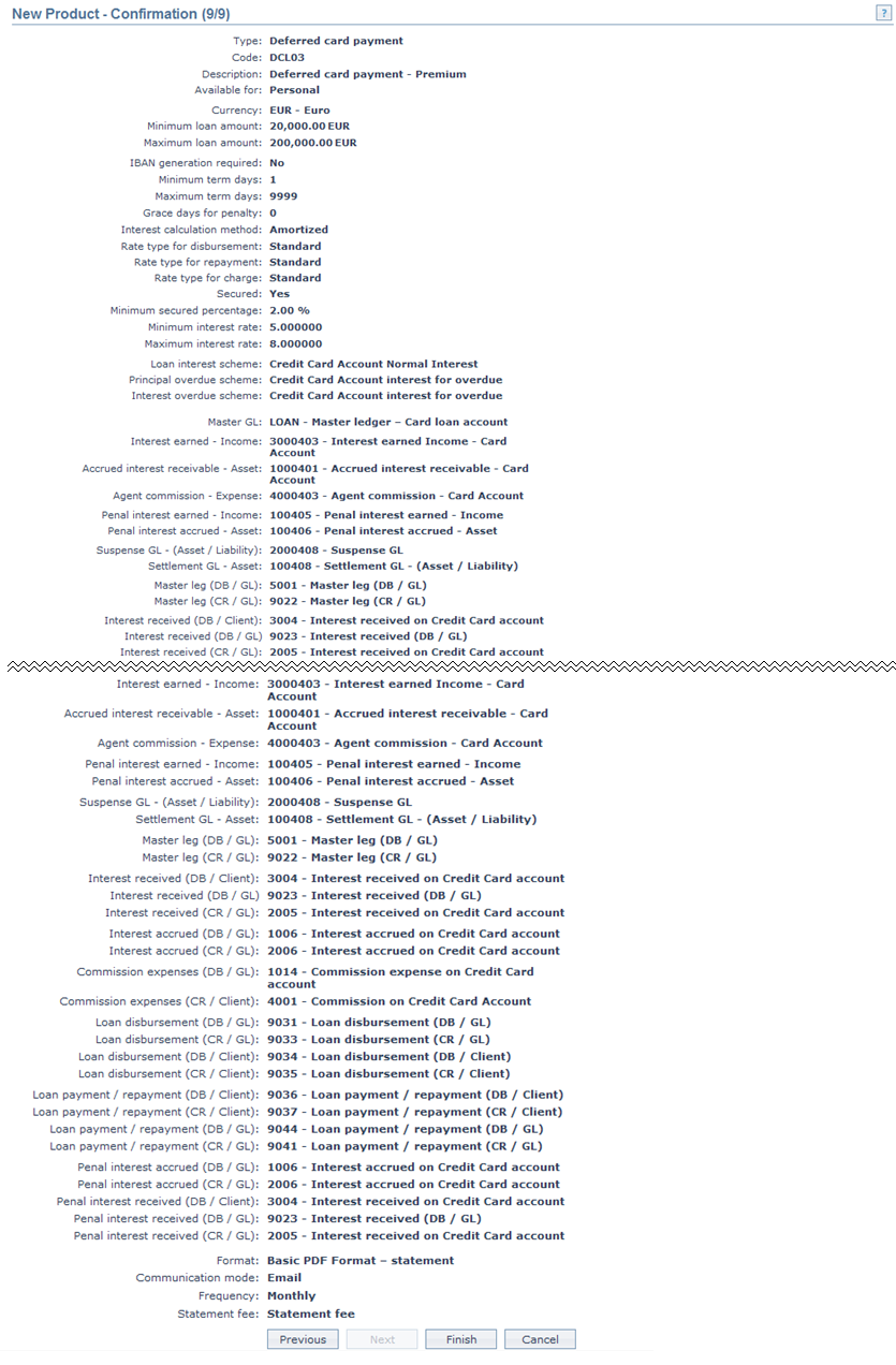 1. Access the Product Maintenance page. Click on the Statement Parameter tab to view the details as per sample below. The details are defaulted from the entries that you made during Product creation. For details refer to Card Loan > New Product → Statement Parameter (8/9).