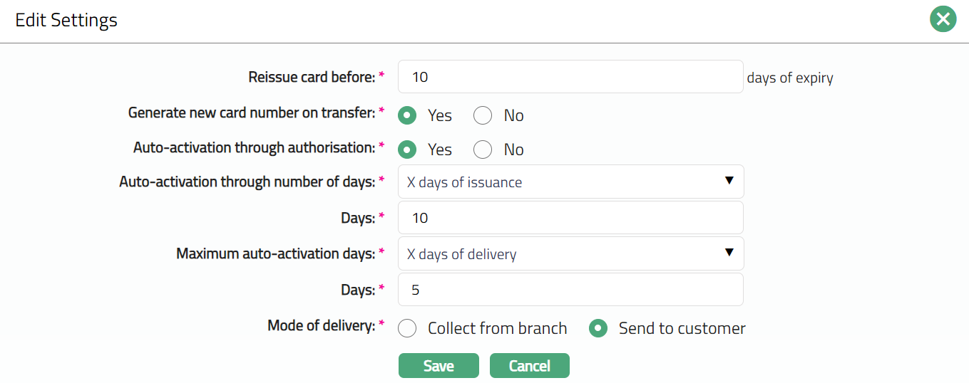 Reissue card before field, enter the number of days. This denotes the number of days before which the card re-issue process needs to start before the card gets expired.