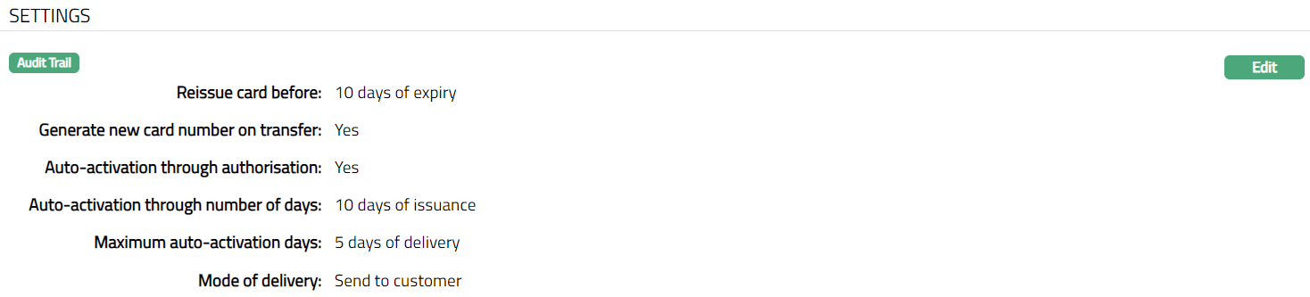 - Access Card Product page. Click Settings tab to view the details as per sample below. The details are defaulted from the entries that you made during Card Product creation. For details refer to New Card Product -- Settings (2/4).